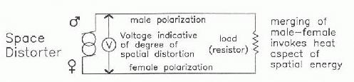 We simply distort space to elicit the basic male-female energetic polarization. Through magnetism we obtain the electrical polarities (+) and (-). The polarizations are conveyed to the "load" by "conductors", materials wherein the recombination of polarities is minimized. The male-female polarizations thus conveyed to the load recombine within the load to produce heat.