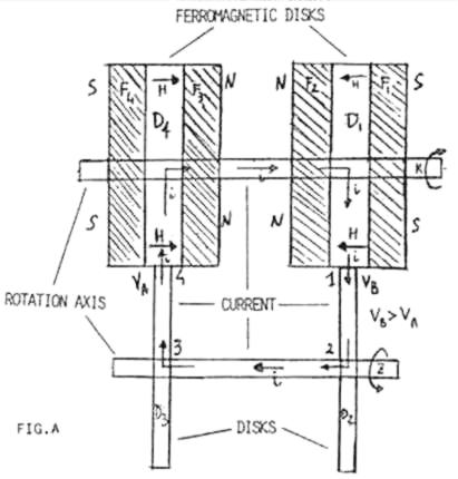 In in fig.(a), the potential Vb, in contact zone 1 of disks D1 D2, is major of potential Va in contact zone 4 of D3 and D4 disks. The sense of such macroscopical model is that it is possible to generate a current with no frictional forces by rotational brushes and overall, so that there does not exist a braking of the four disks for the peculiarity of homopolar induction (8). A better improvement is to put also magnets on the rotational brushes D2 and D3, and so to have in the iron disk D2 a magnetic field equal to disk D1, and in disk D3 a field equal to disk D4.